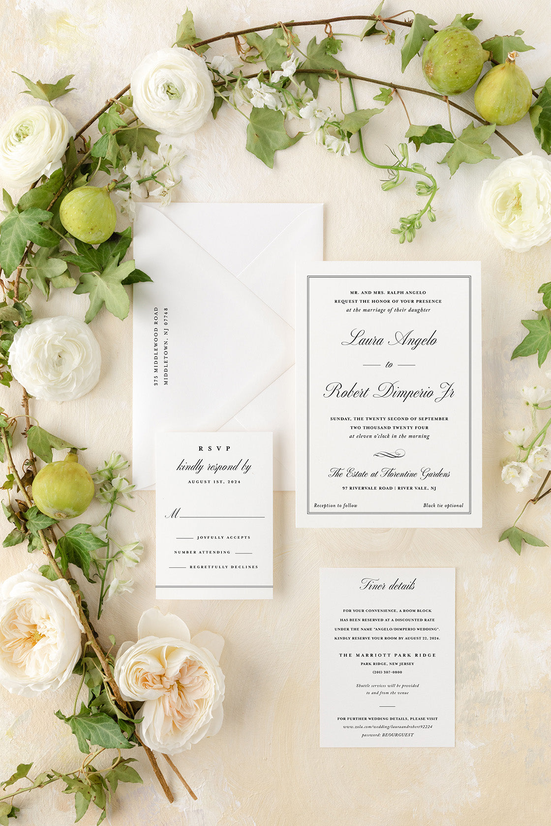 All of our Signature Suites include the invitation with envelope (complete with guest and return addressing) and Response Card. Additional pieces, such as a Details Card, can be added through our Finishing Touches to further personalize your suite.